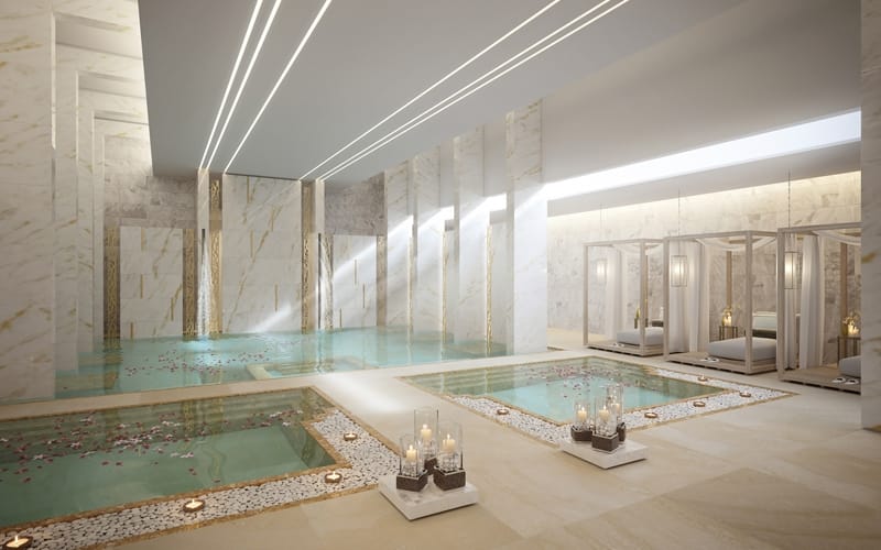 - Water Therapy Suites (Khu Thủy Trị Liệu): Bể sục nóng, hồ ngâm lạnh (plunge pool), phòng xông hơi (sauna), phòng xông hơi ướt (steam room), và vòi sen thủy lực.